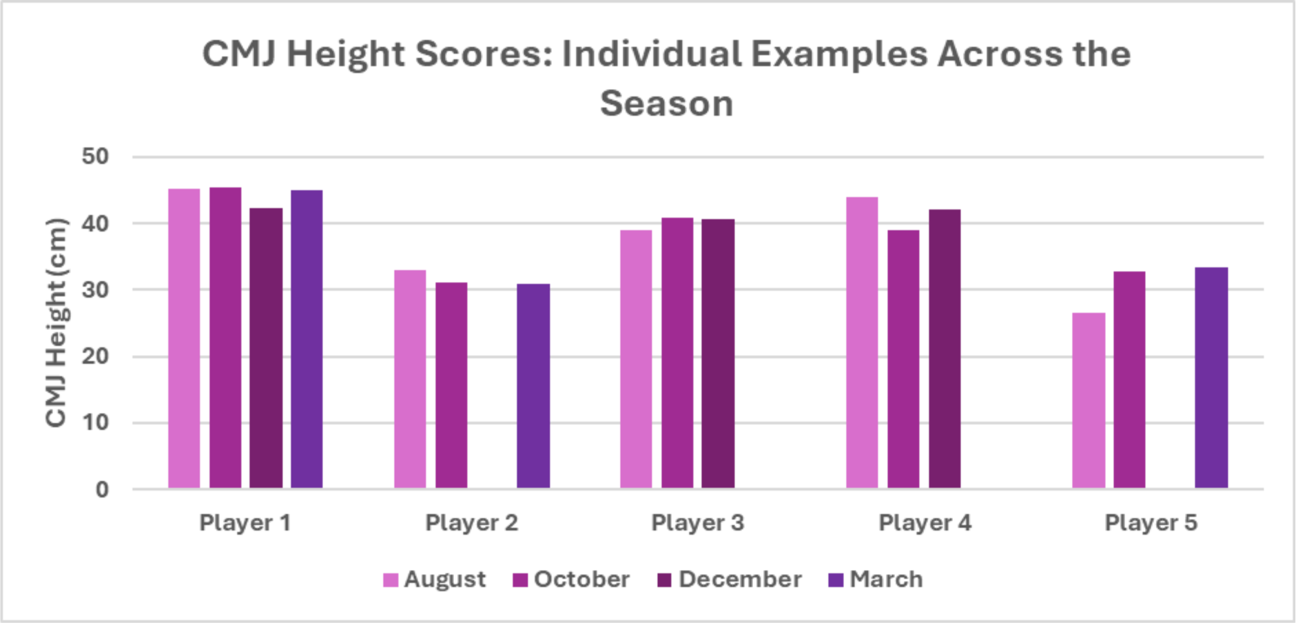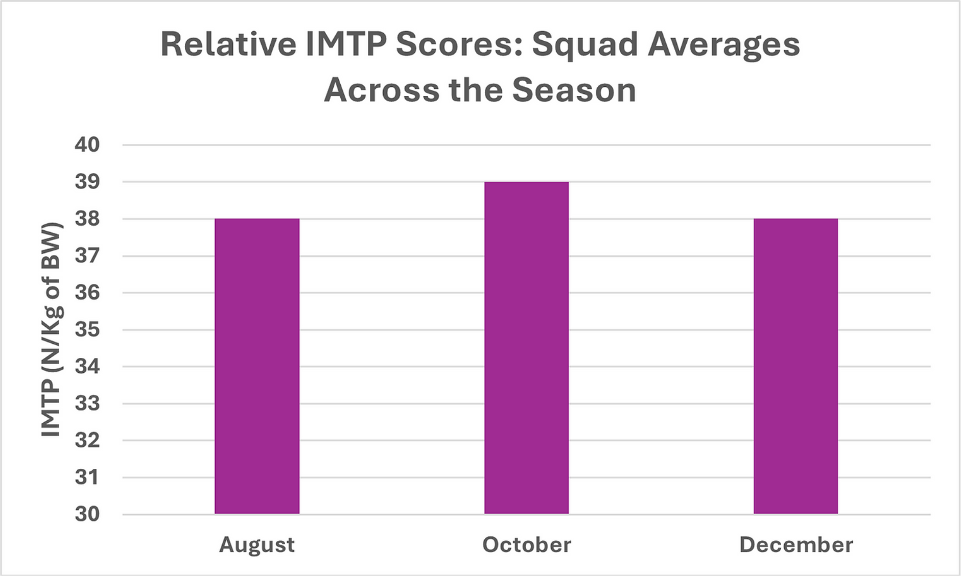 This season, by monitoring athletic performance through jump testing (for power) and the isometric mid-thigh pull (for strength) at various points in the season, we were able to manage that balance effectively. As a result, every player either maintained or improved their strength and power metrics across the competitive calendar. This trend is illustrated in the bar charts below. Ultimately, this consistent progress provided them with the best possible foundation to perform at their peak on the ice.